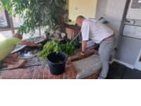 One of our summer holiday jobs is the demolition of the fish pond inside the Reception at Holy Cross School. The pond was home to 10 goldfish which had to be re-ponded before demolition. Foster 'Dad' Peter Wiffen came to the rescue today and removed the fish before transporting them in three buckets to his pond where the new arrivals met the six who have made that pond their home for 15 years!